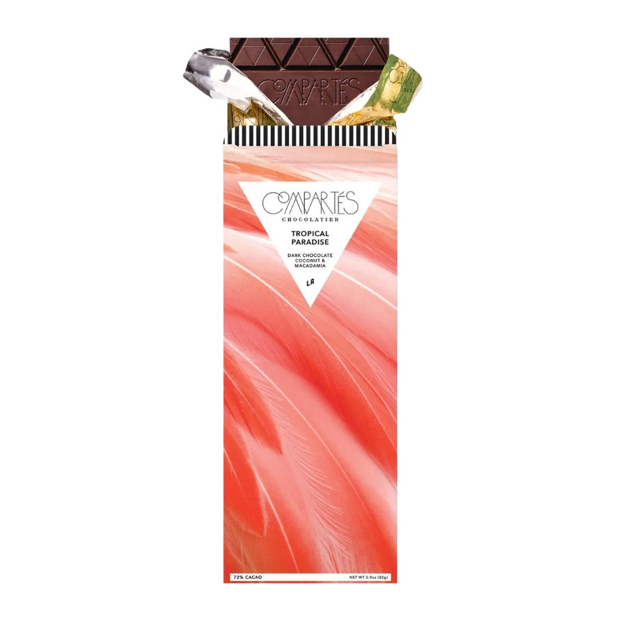 Delicious, gorgeous and absolutely delightful - its Compartes new Tropical Paradise Chocolate bar - deep dark (vegan) chocolate hand studded with perfectly roasted plump macadamias and toasted coconut - a combination made in your tropical dreams!