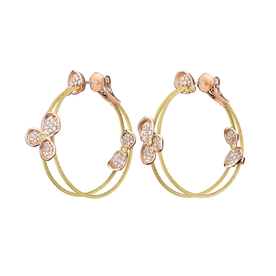 Sparkling white and yellow diamonds are set in 18k rose gold forget me not flower petals, scattered on 18k yellow gold double wire hoop earrings.
