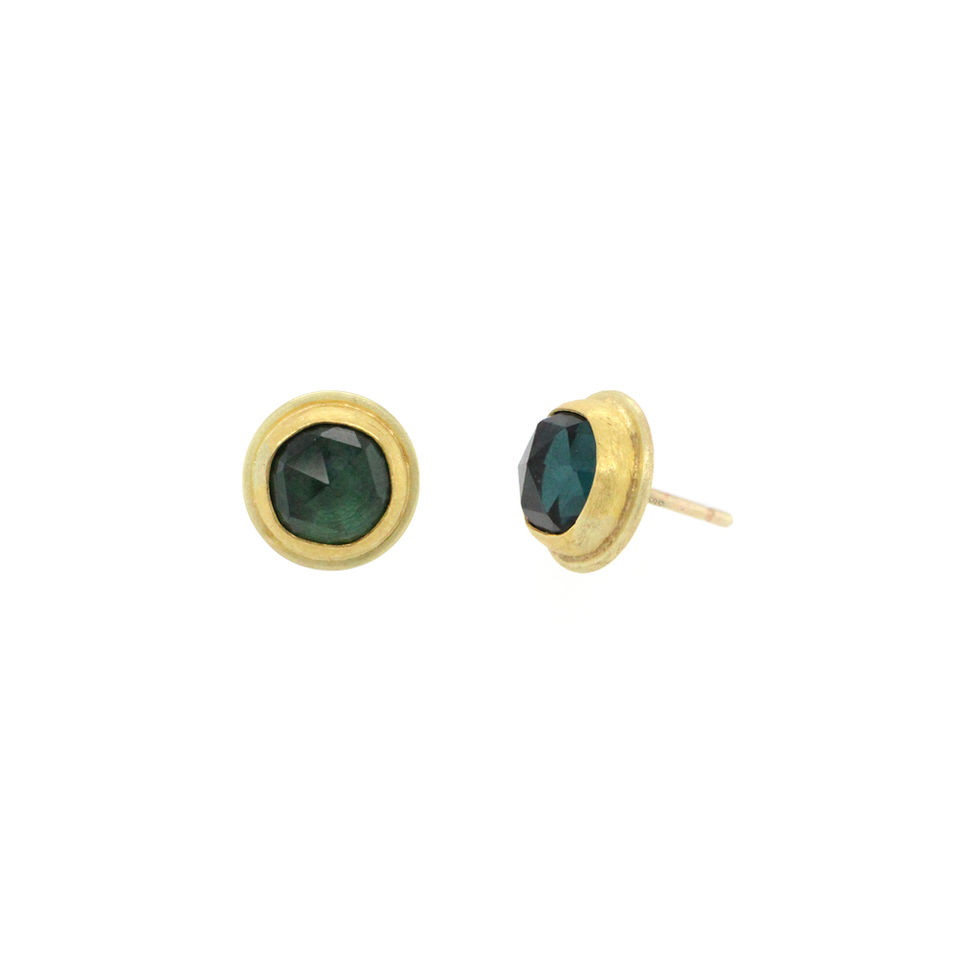 Round, deep green, rose-cut tourmaline is bezel set in matte finished 22k yellow gold on 18k gold post backs.
