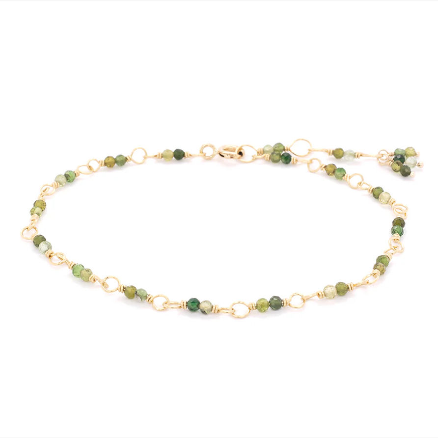 This natural gemstone bracelet from the Anne Sportun Wrap Collection is the perfect addition to your daily stack. A thin row of gemstones tied with 14ky gold adjustable to any length up to 7.5" with a little tassel at the end.