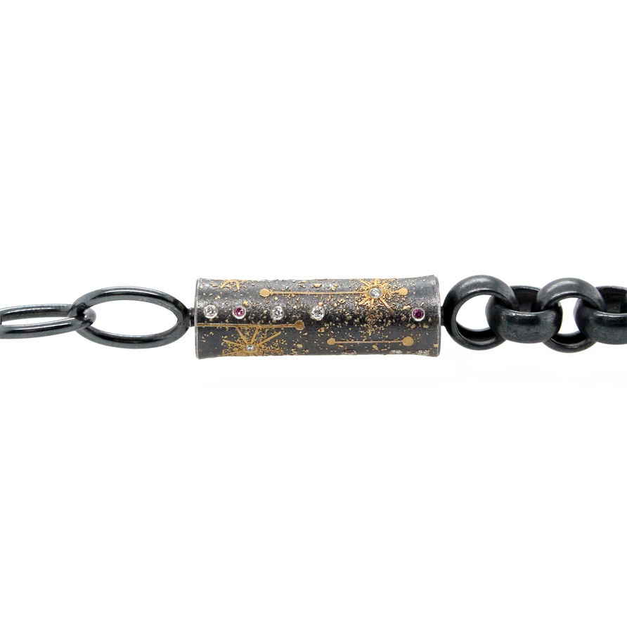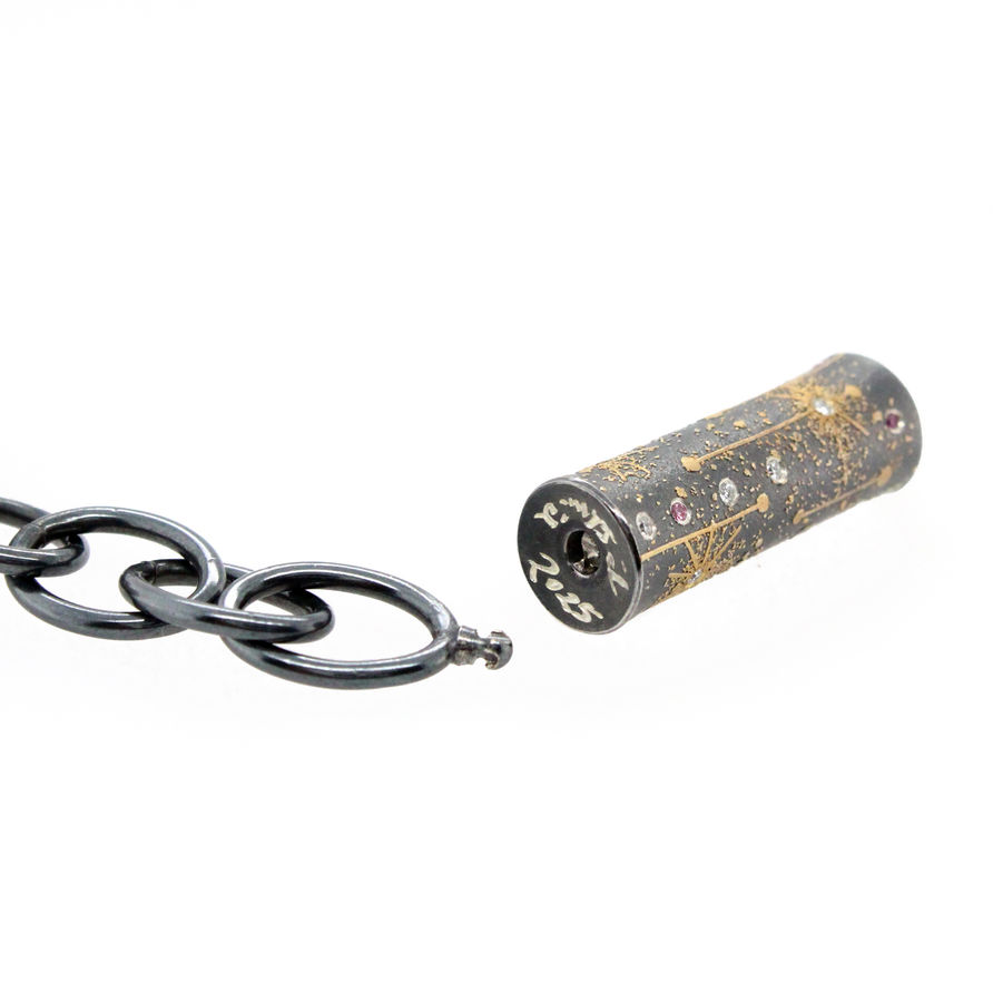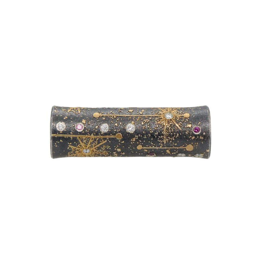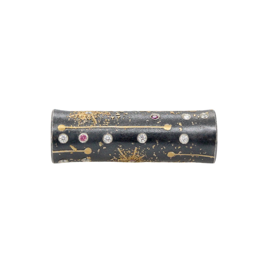 24k gold bursts and sparkling white and pink diamonds decorate the surface of this sterling silver, barrel shaped vario clasp component to be combined with other chains and pearl strands from Atelier Zobel.