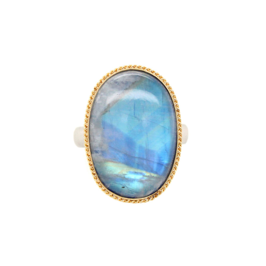 A smooth, oval shaped moonstone is set in a gold bezel, accented by gold chain, and set on a rounded sterling silver band.
