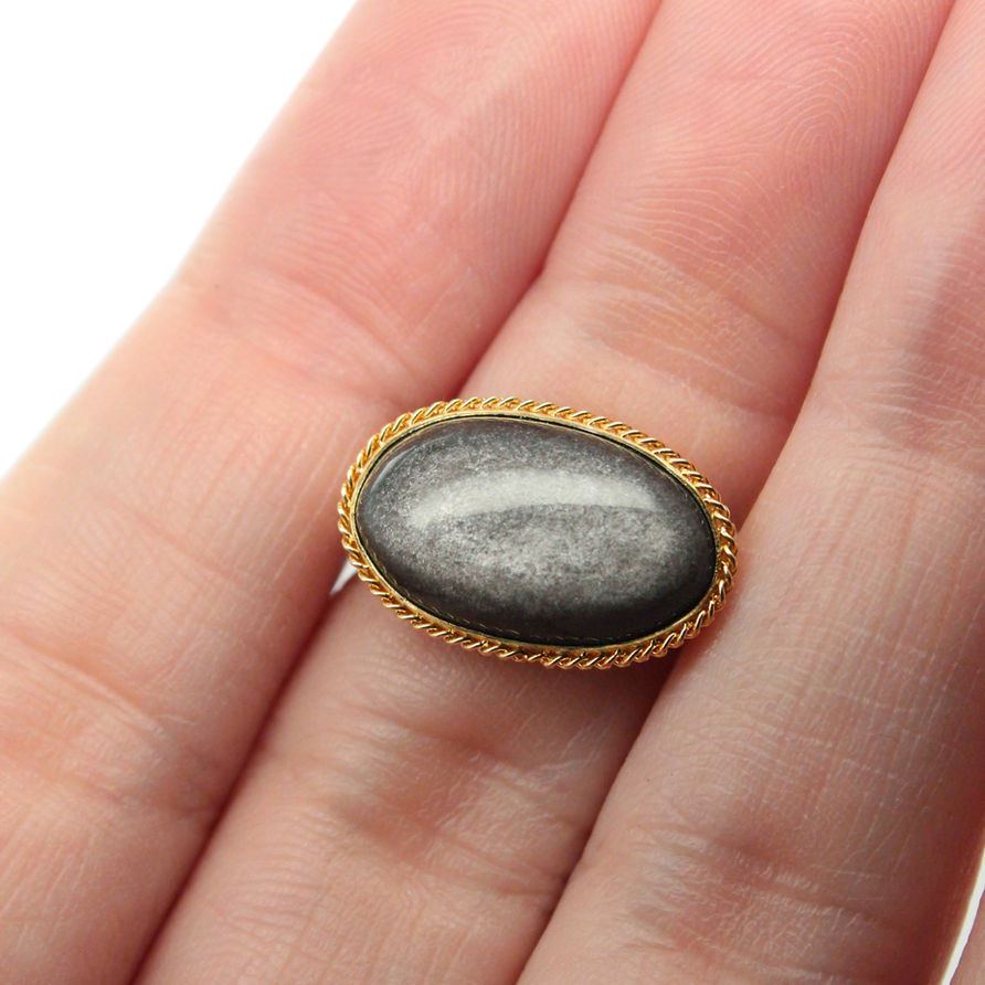 A smooth, oval shaped obsidian is set in a gold bezel, accented by gold chain, and set on a rounded sterling silver band.