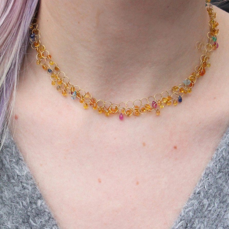 A double strand of 18k gold, hand made circle chain holds a 'circus' of gemstone briolettes in pinks, yellows, greens and blues.