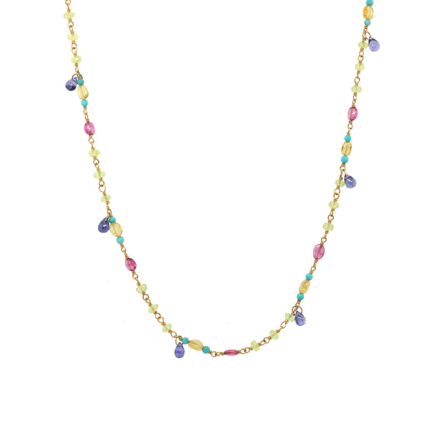 A variety of gemstone beads in multiple shapes are wrapped with 22k gold wire to form this elegant and playful necklace, secured with an 18k gold clasp.