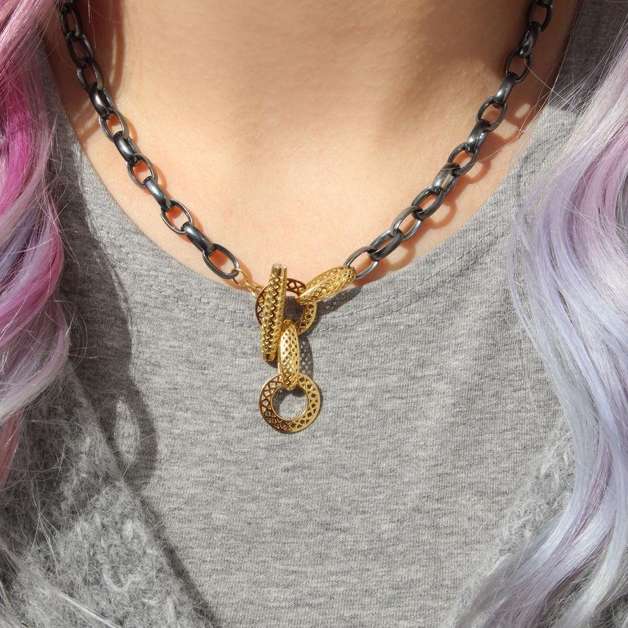 This oxidized sterling silver belcher chain necklace features yellow gold crownwork® accent links and a diamond toggle clasp. Wear alone or add your favorite Ray Griffiths pendant to this versatile piece for a new look.