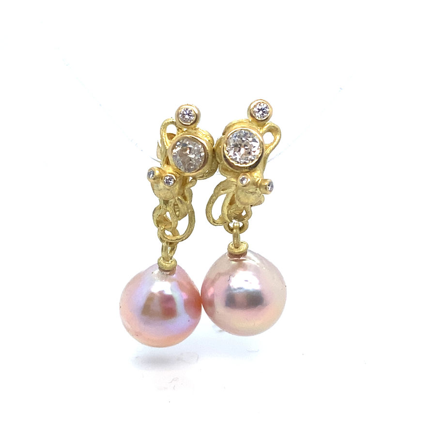 18k gold, white diamonds (0.10cttw), old mine cut diamonds (0.65cttw), pink freshwater pearls
