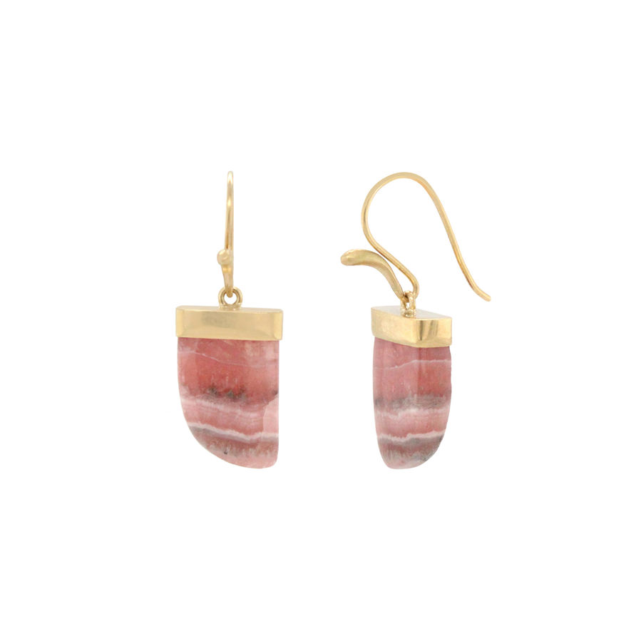 These one of a kind earrings feature pink rhodochrosite claws set in yellow gold and hanging from gold hooks.