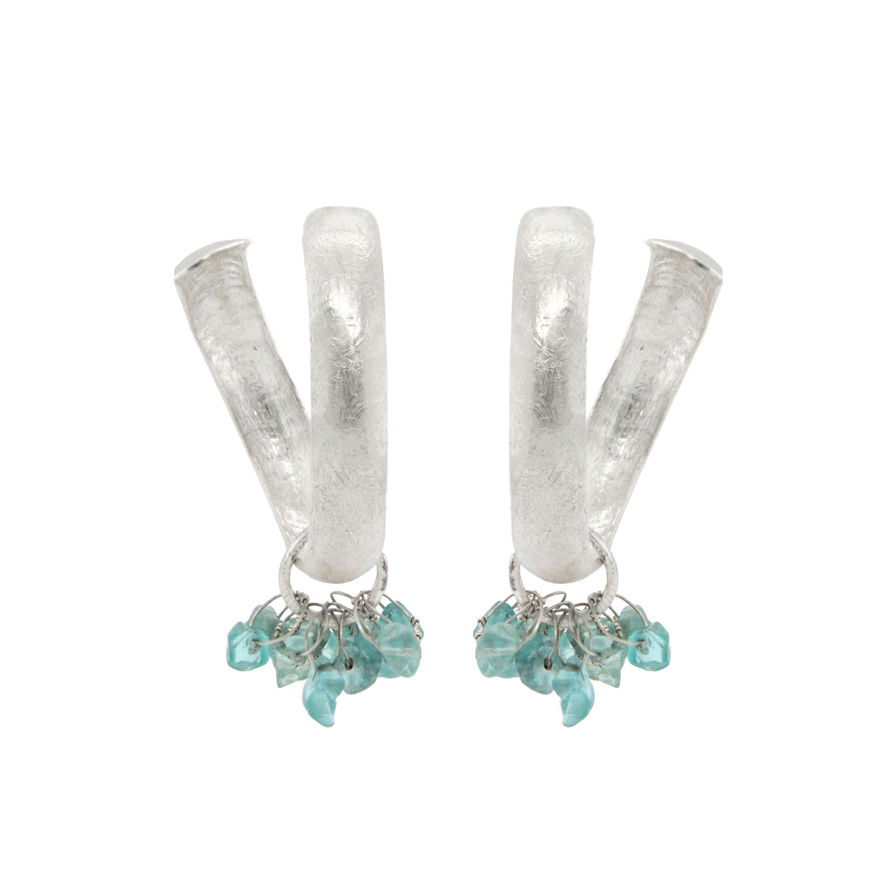 Curved silver spiral hoops hold a cluster of blue apatite beads that sway as you move. The cluster can be taken off of the earring for a new "twist" on the classic hoop shape.