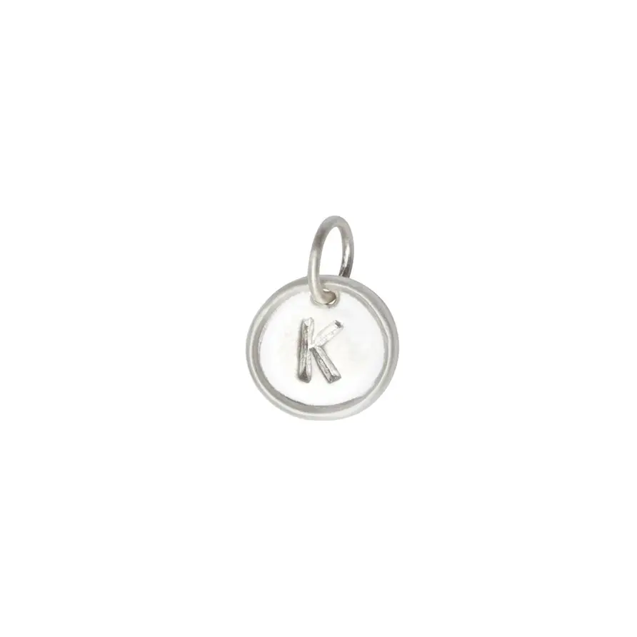 This tiny sterling silver disc has a matte finish and is stamped with an initial.