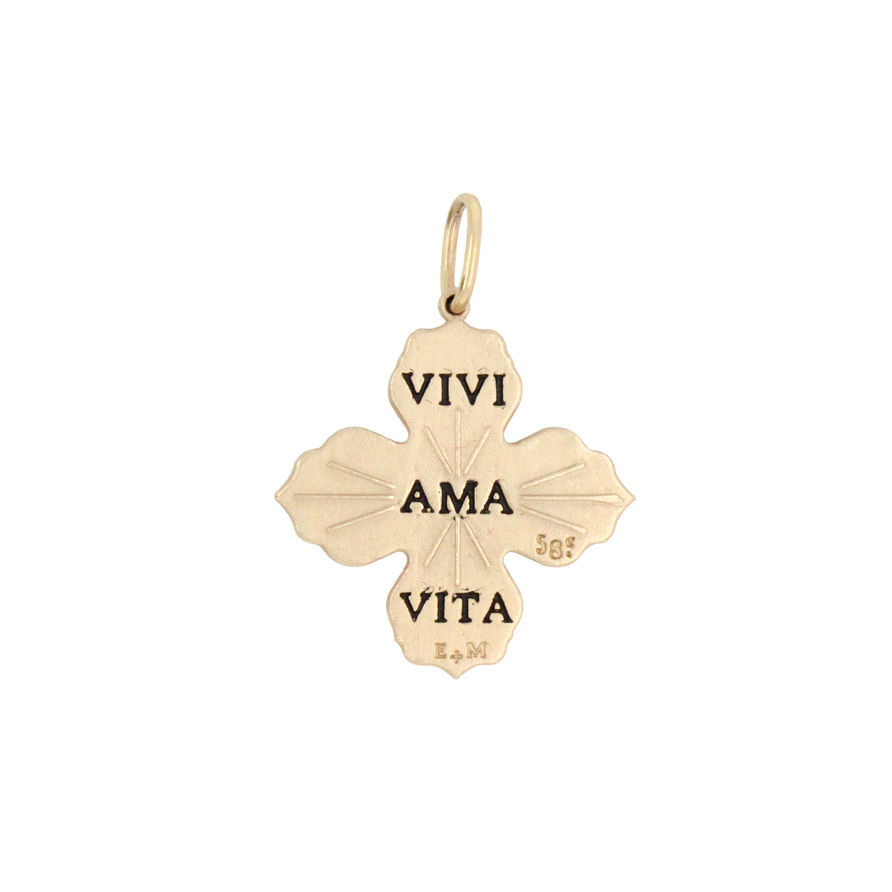 This yellow gold, turquoise cabochon and diamond four point charm features the phrase 'live, life, love' on the back.