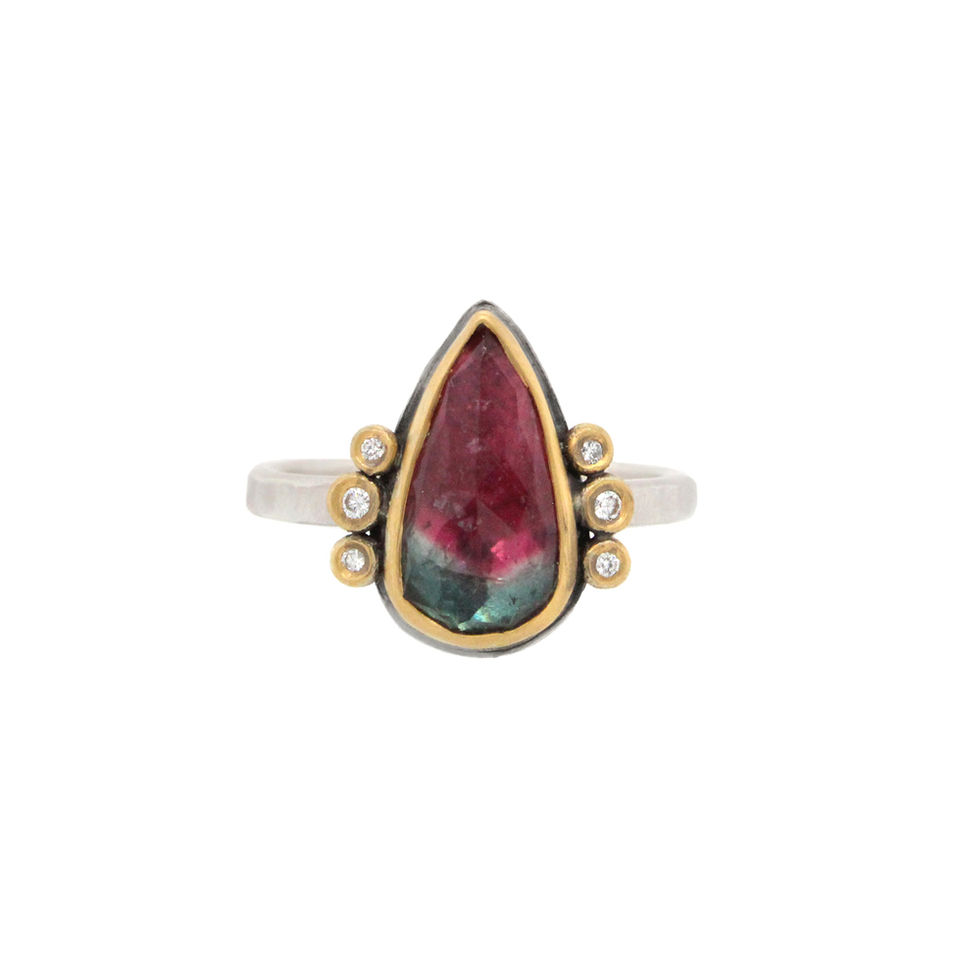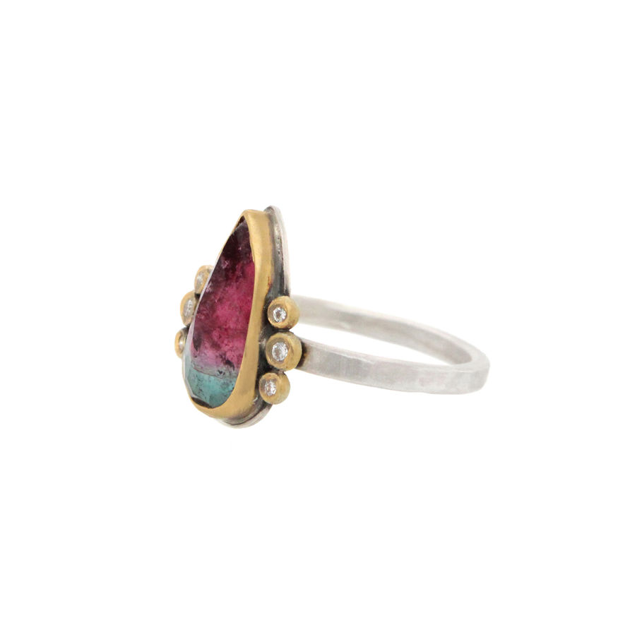 A teardrop shaped, rosecut watermelon tourmaline is bezel set in 22k gold, flanked by six sparkling diamonds, and backed in sterling silver on a slim silver band.