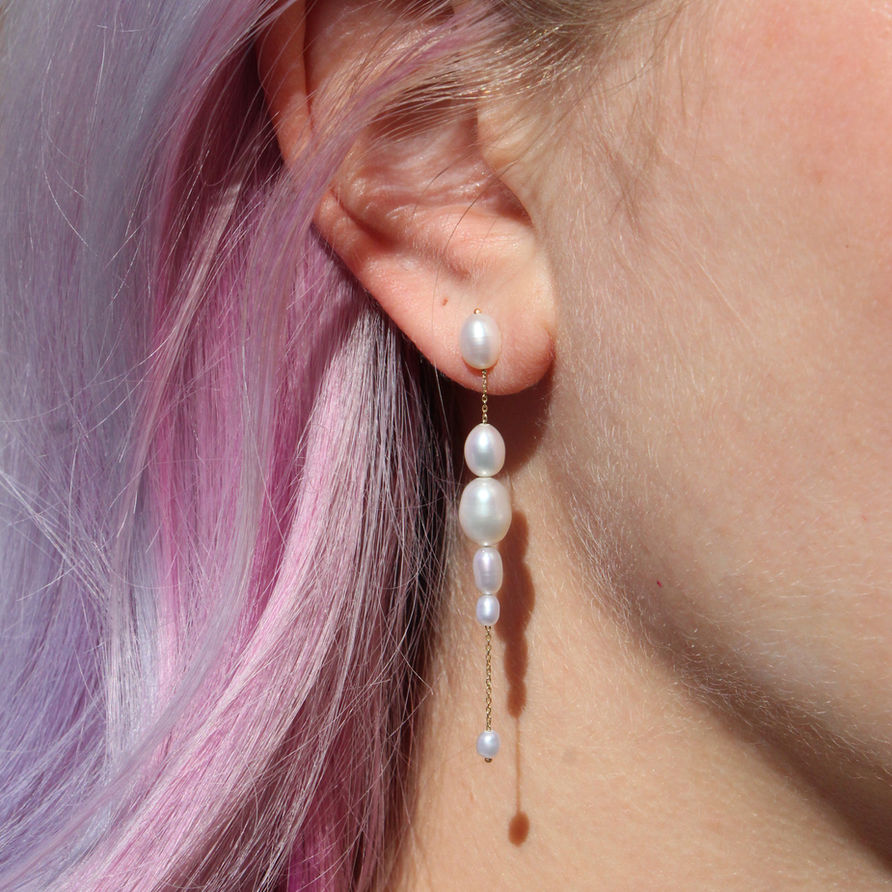 A cluster of graduated white pearls is threaded on long gold chain with a post backing.