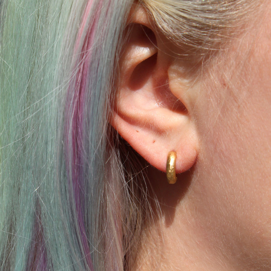 The most perfect chubby open huggie hoops, featuring a subtle hammered texture.