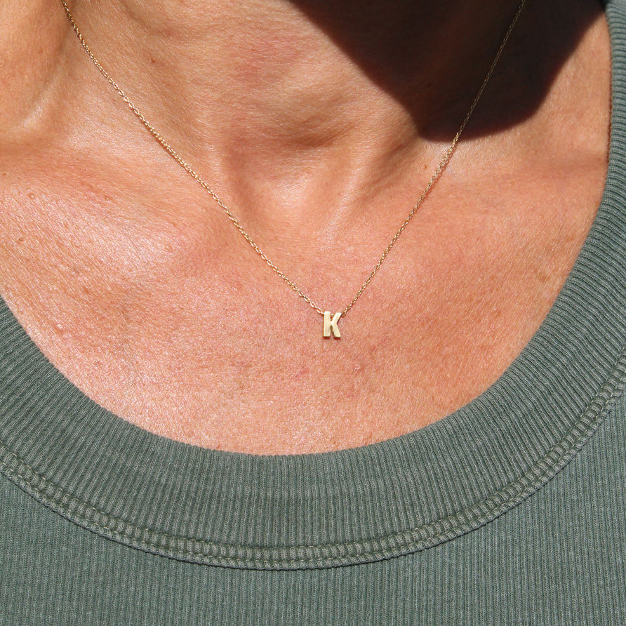 Minimalist luxury: the Micro initial K pendant measures only a quarter inch high and features a soft satin finish, hanging on a delicate cable chain with a simple lobster clasp.